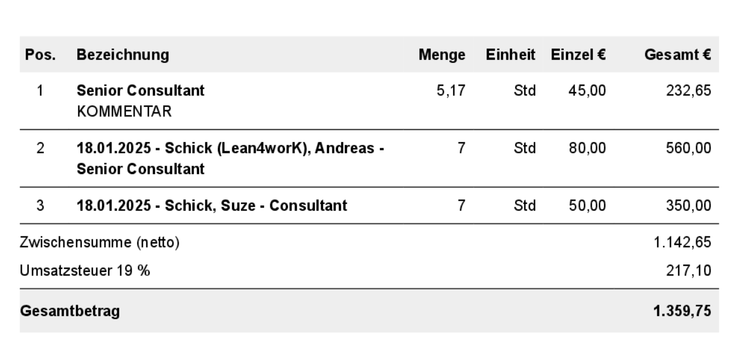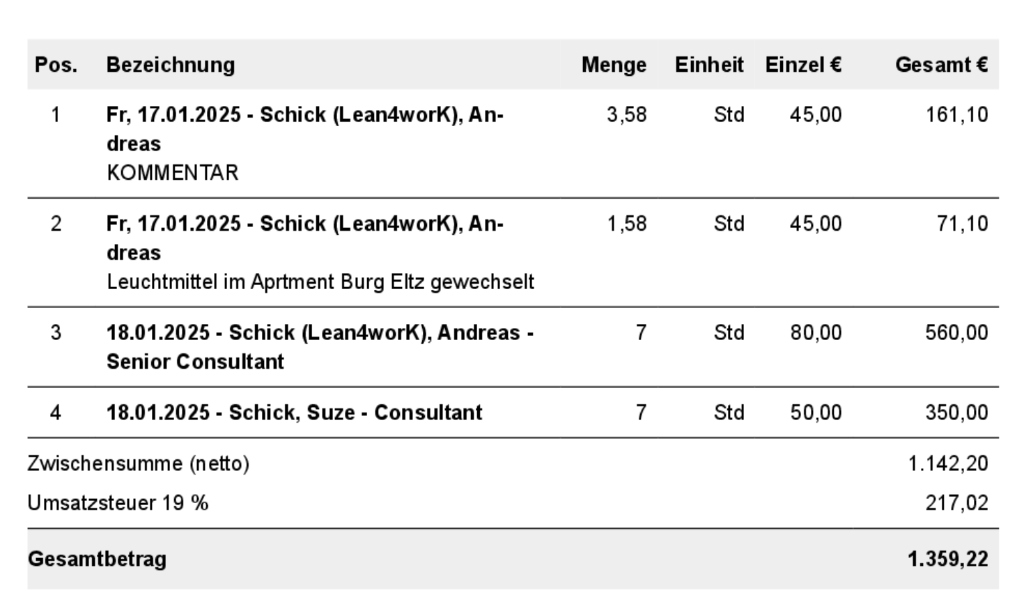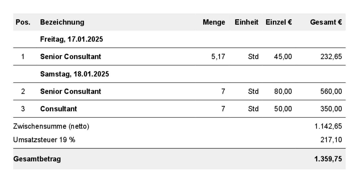 Bei dieser Einstellung wird jeder Zeiteintrag einzeln auf der Rechnung aufgeführt. Sie sehen für jeden Mitarbeiter und jeden Tag einen separaten Eintrag mit Datum, Name und Arbeitszeit.