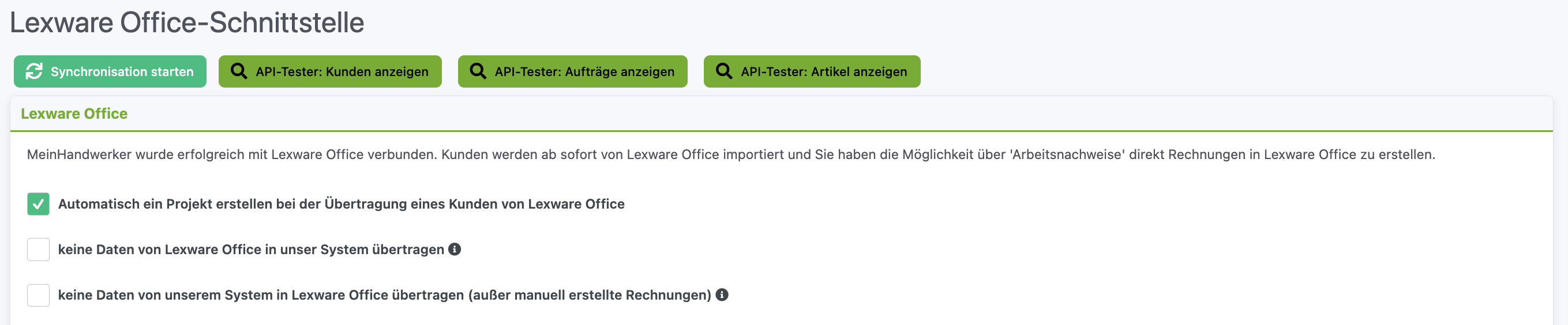 Die Synchronisationsoptionen finden Sie in den Einstellungen Ihrer Lexware Office-Schnittstelle: