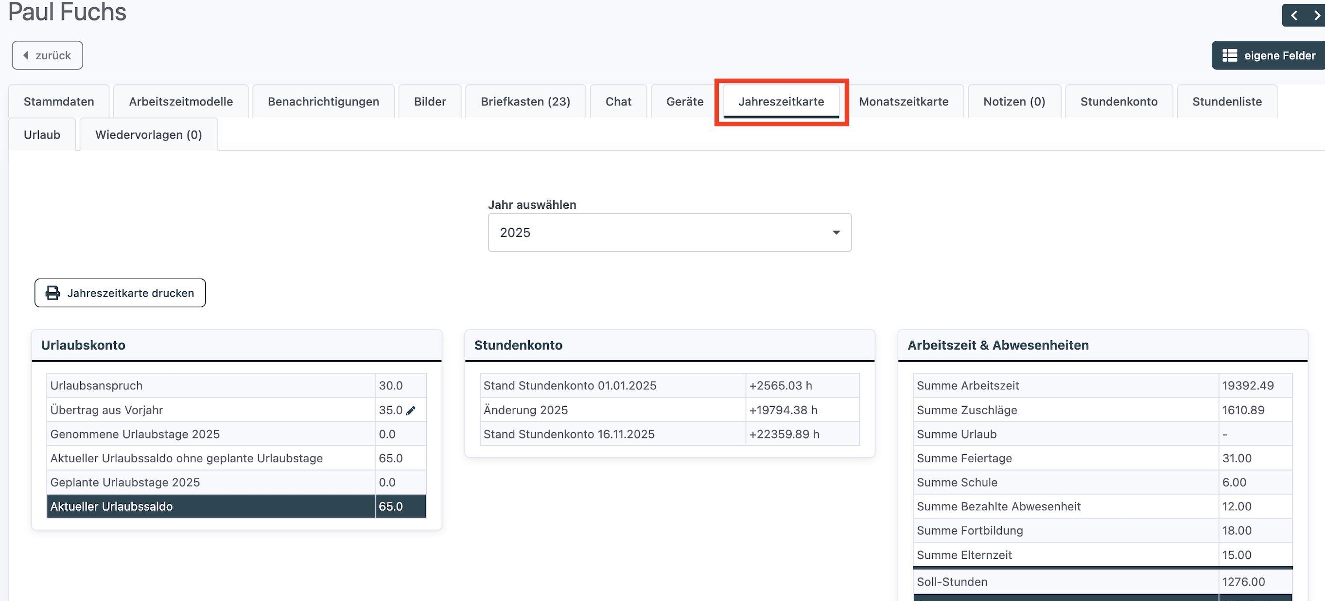 Die Jahreszeitkarte bietet Ihnen eine kompakte Jahresübersicht über die wichtigsten Zeiterfassungsdaten eines Mitarbeiters. Diese Ansicht ist besonders hilfreich für den Jahresabschluss, wenn Sie Nachweise über Resturlaub und Überstunden für Ihren Steuerberater oder Ihr Lohnbüro benötigen.