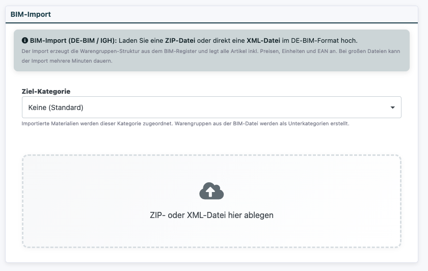 Vor dem Upload können Sie eine bestehende Kategorie als Ziel-Kategorie auswählen. Alle aus der BIM-Datei importierten Warengruppen werden dann als Unterkategorien darunter angelegt.